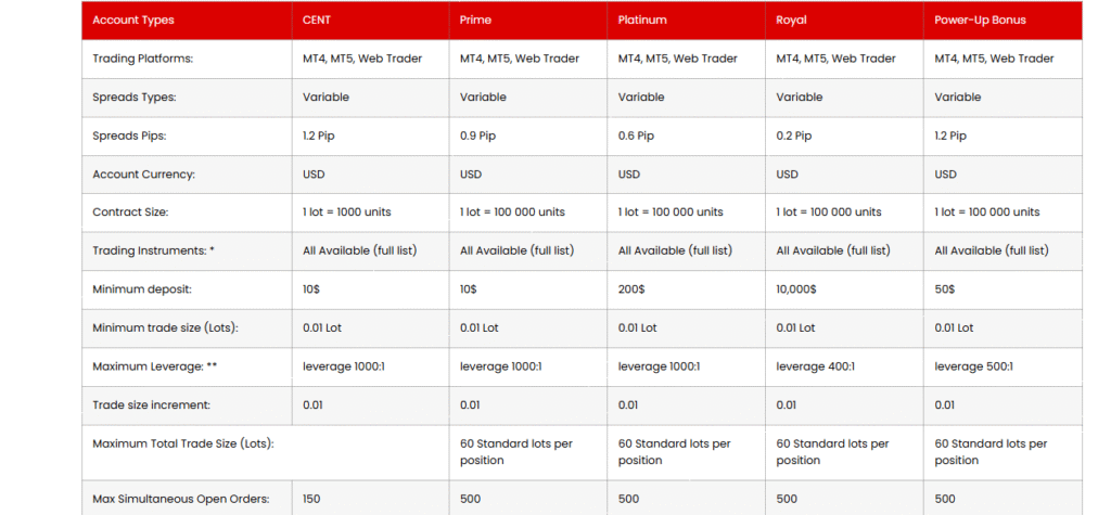 XtremeMarkets offers different account types with varying spreads and commissions. The Cent Account has a spread starting from 1.2 pips with no commission. The Prime Account offers a spread from 0.9 pip and no commission. The Platinum Account provides direct market access with raw spreads and no commission. The Royal Account has spreads from 0.2 pips with a $2 commission. The Power Up Bonus Account offers spreads starting from 1.2 pips, unlimited trade volume, and no commission for forex pairs.